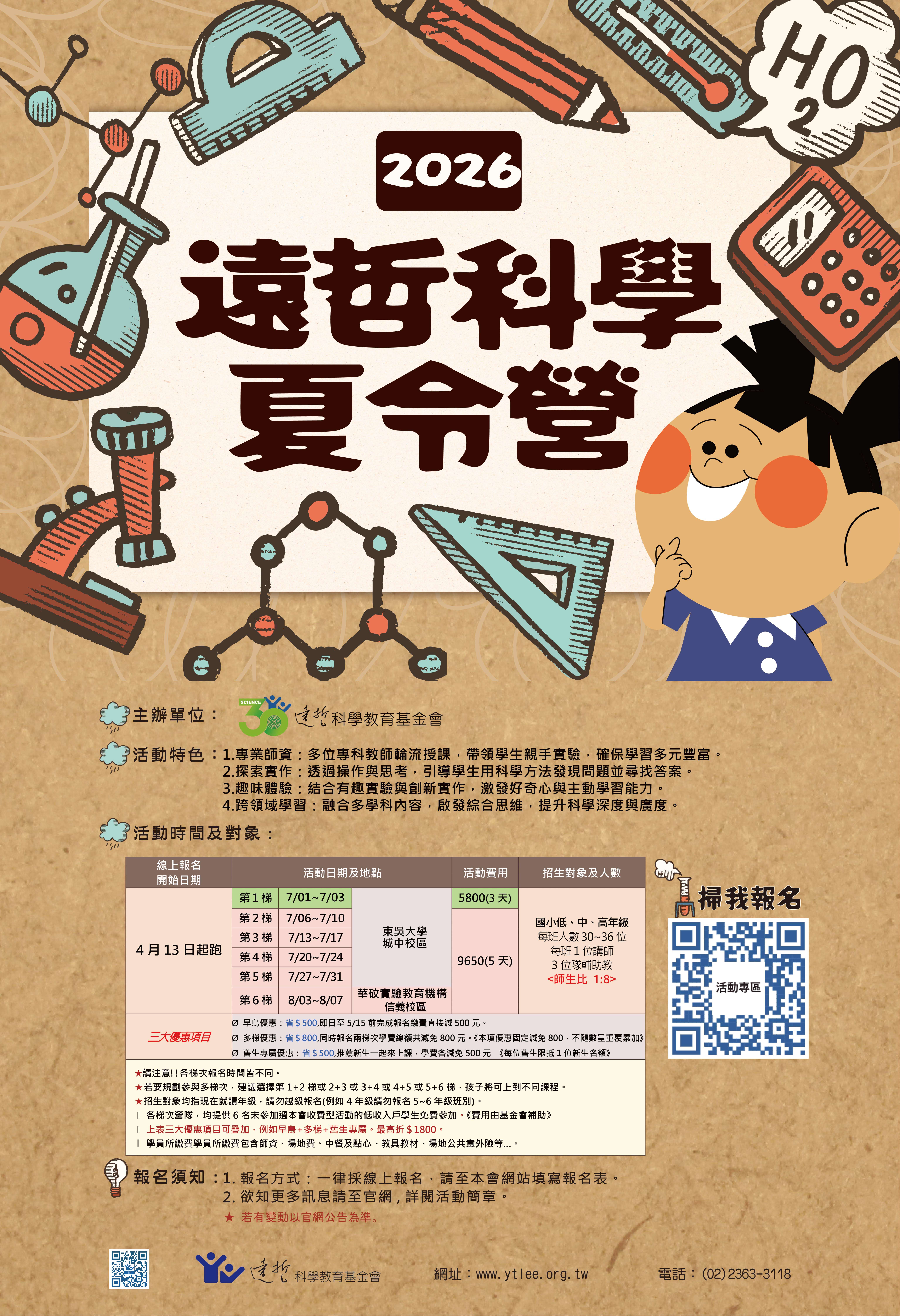 一、活動宗旨: 為推廣科學與數學素養教育,啟發學生創造力與邏輯思考能力,本會擬於 2026 年暑期舉辦旨揭活動,透過手作與實驗體驗科學趣。