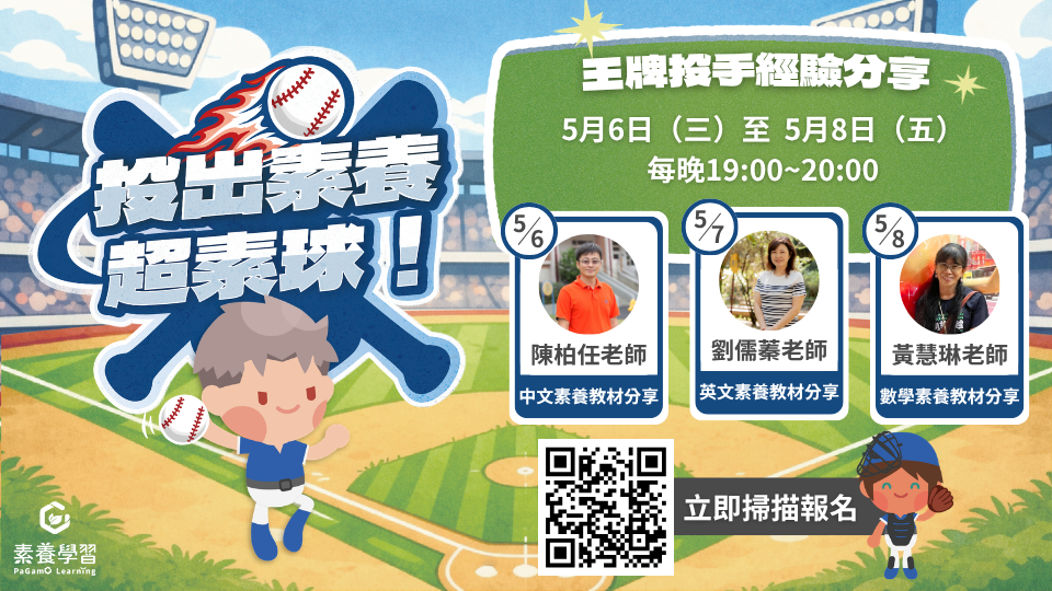 (2) 辦理時間:5 月 7 日(週四)19:00~20:00。 (3) 課程內容:PaGamO 英文素養教材介紹與執行成效分享、教材體驗試用、教學應用實務經驗分享。 4、 數學素養專場:邏輯建模・完美守成 (1) 課程講師:PaGamO 領航家 黃慧琳老師。 (2) 辦理時間:5 月 8 日(週五)19:00~20:00。